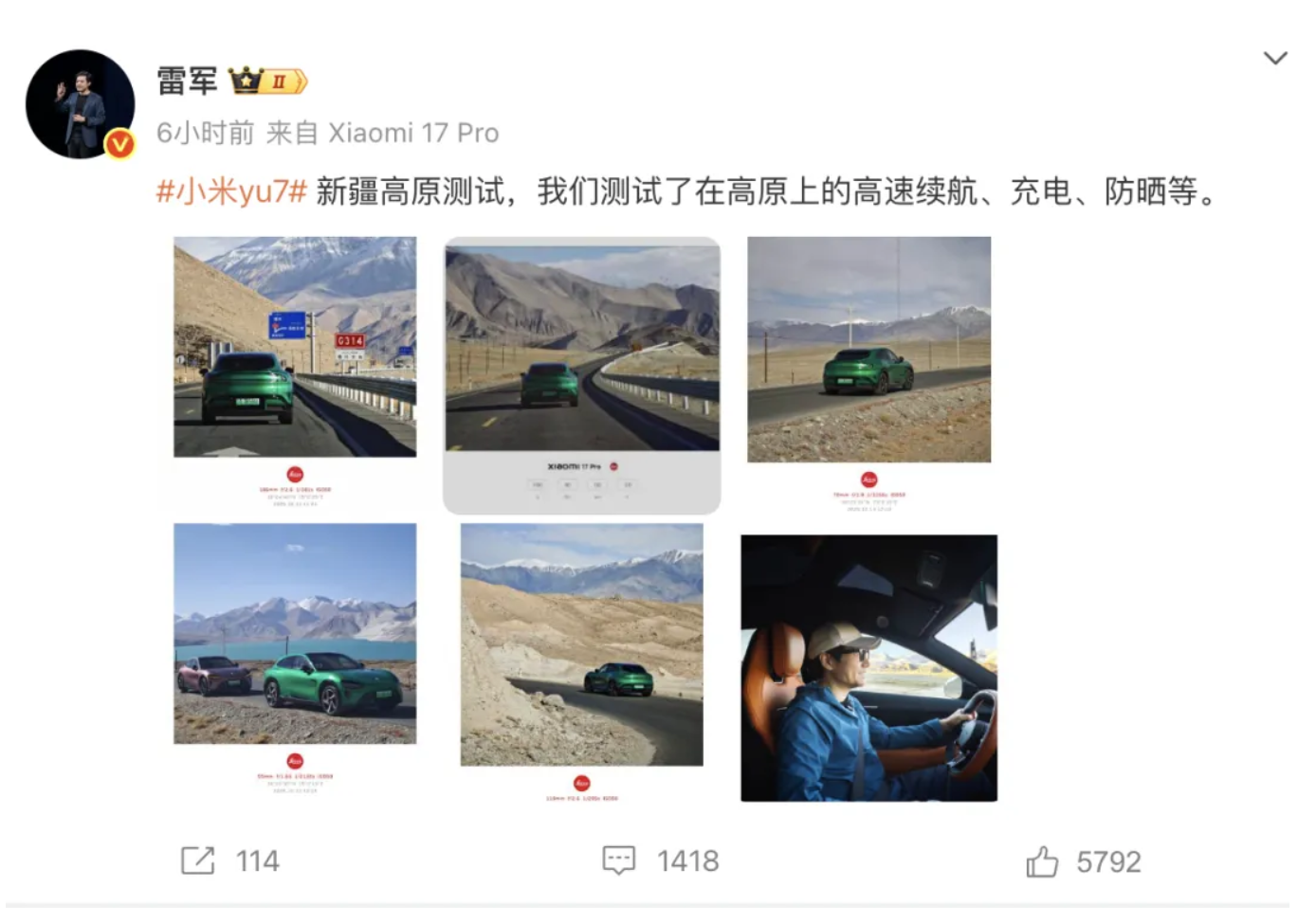 就在车祸事发前一日,雷军还通过社交媒体积极宣传小米YU7在新疆的高原路测进展。今日,雷军微博再度更新状态称:“新疆高原测试,我们测试了在高原上的高速续航、充电、防晒等。”